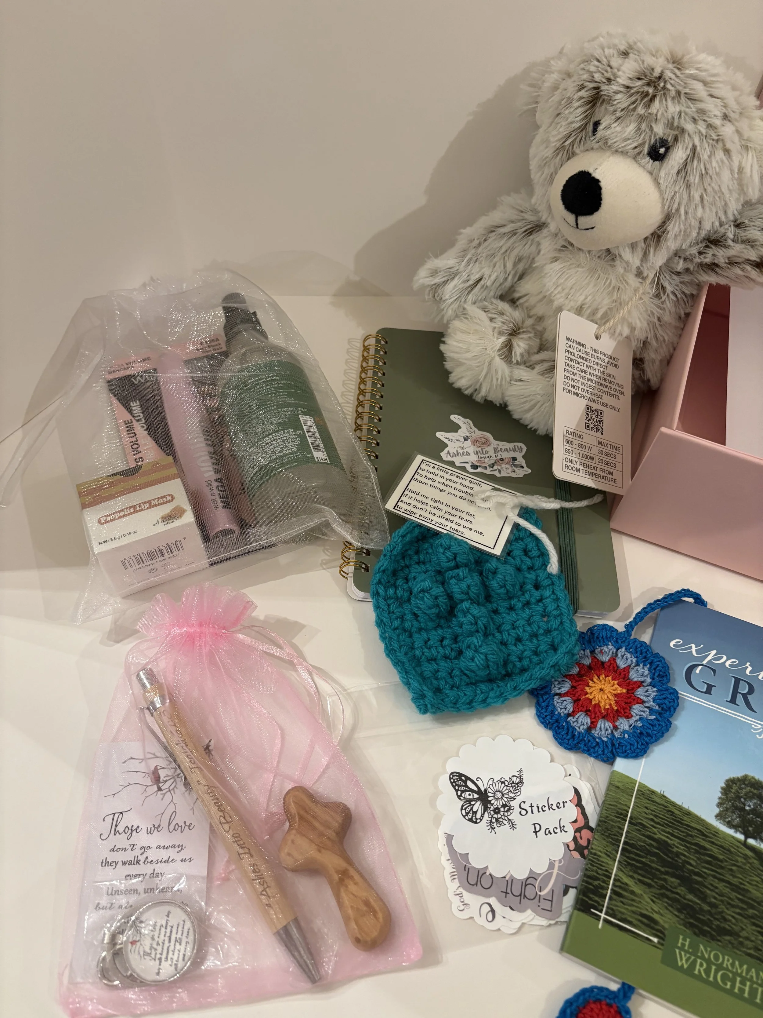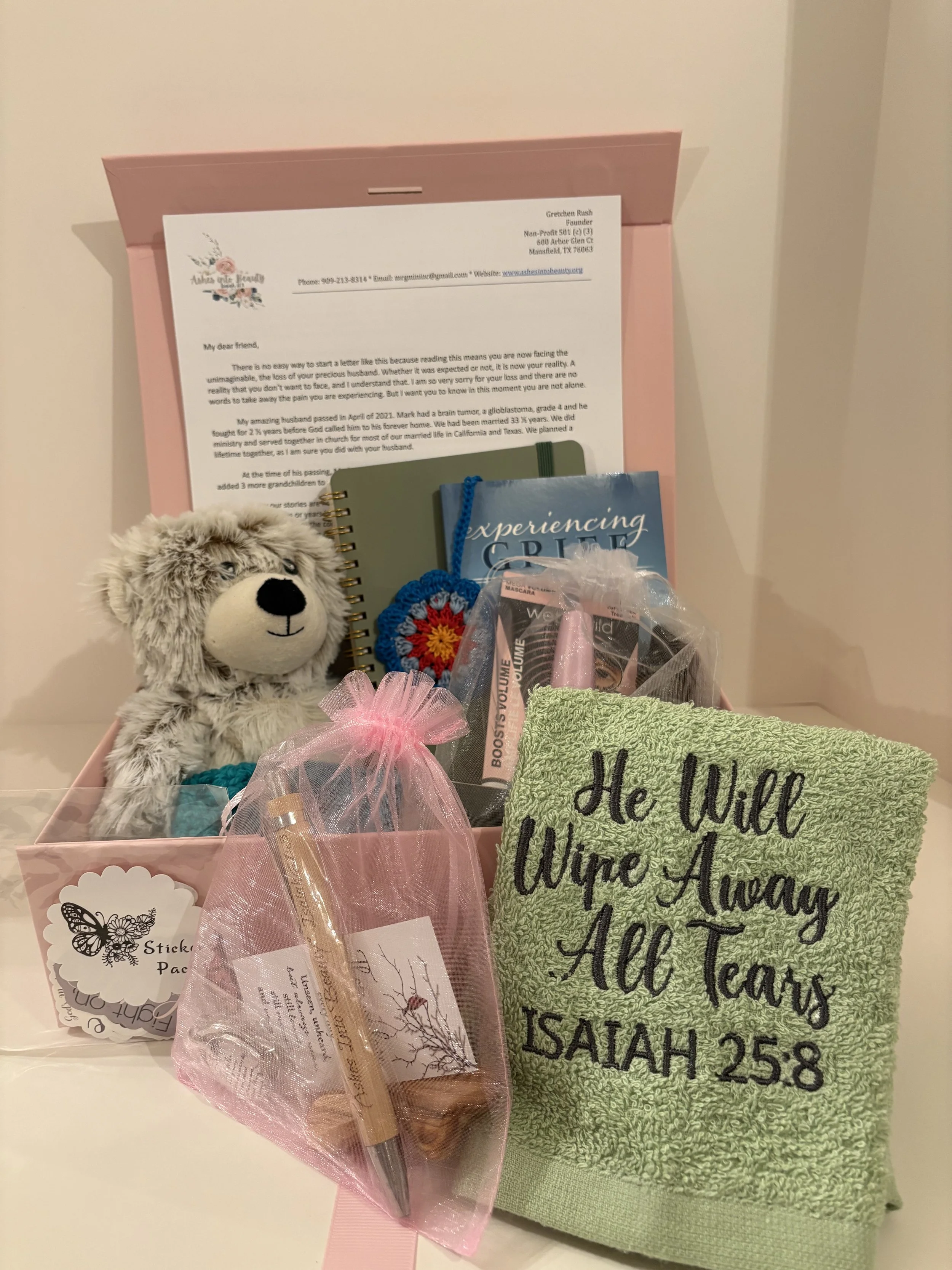 Sponsor a box for a widow ($60). The box includes: a reusable box, small teddy bear Warmie, a journal and pen, bookmarks, stickers, book on Experiencing Grief, small cross, prayer square, mascara, pillow spray, a hand embroidered towel with the words, “He will wipe away every tear,” a keychain, and lip balm. I included a letter from myself, a list of verses and songs that ministered to me, and a list of things to do/know now that their husband has passed. (below are pictures of the widow box and contents).